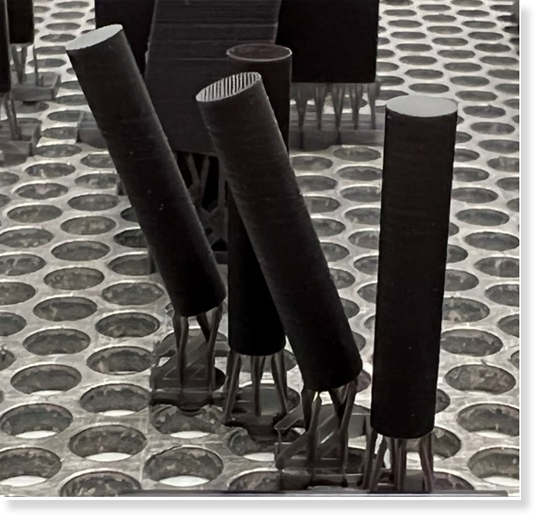 If smooth, cosmetic features are the goal, build parts vertically. Building at an angle will cause visible layer lines as shown on the angled cylinder.